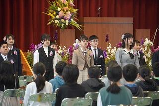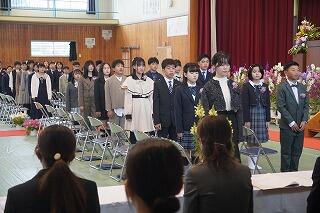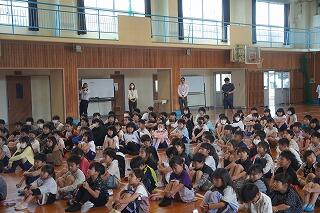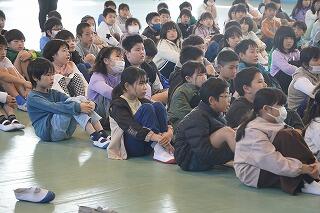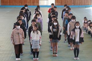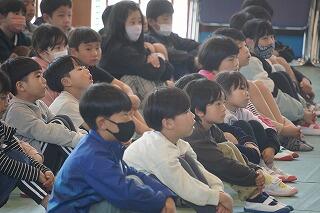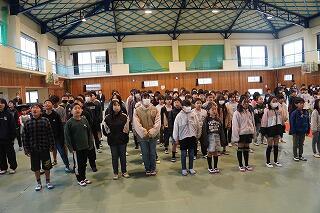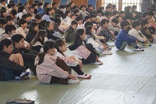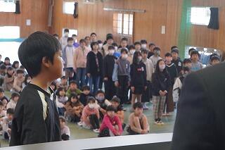 校長先生からのお話の後、生徒会による中学校紹介がありました。クイズや写真をたくさん取り入れたプレゼン資料を使って、小学生に分かりやすく説明してくれました。中学生のはきはきと、語りかけるような話し方や表情、プレゼン資料の作り方と、どれもすばらしく、6年生の子どもたちも「あのような、中学生になりたい!」という思いをもったと思います。最後に、2月2日(土)に開催された、都城市小・中学生プレゼンコンテストでの庄内中学校の発表動画『僕たちはどう生きるか』が上映されました。なんと、庄内中学校は中学生の部で「最優秀賞」を受賞したのです。おめでとうございます。この発表動画にも圧倒されました。こんなすばらしい先輩たちが学ぶ中学校で、一緒に学べるなんて、子どもたちも中学校生活がさらに楽しみになったことと思います。