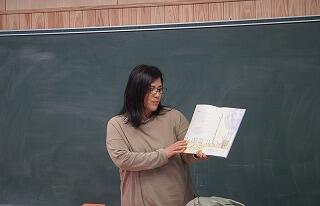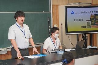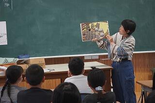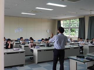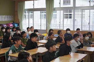 授業の前半では、松永様による土木と建設業の使命についての講話があり、「土木の仕事は、人が生きるために必要なものや、安心して暮らせる社会をつくる仕事」と、日本各地や海外での御自分の仕事を紹介しながら説明してくださいました。また、国土交通省の職員の方からは、道路の役割や作り方、都城志布志道路の使命について、データを示しながら具体的に説明していただきました。