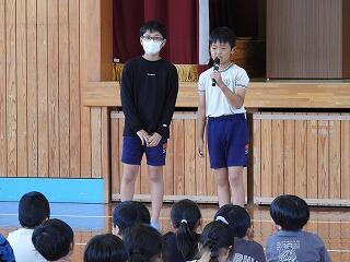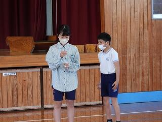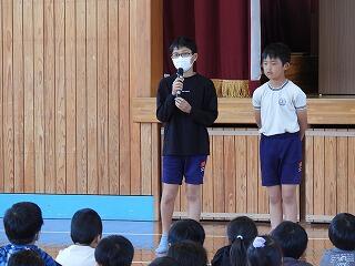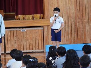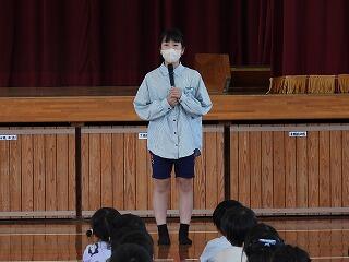 後半は全校朝会を行いました。校長先生からは、「自分から」をテーマに話がありました。