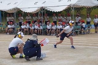 まずは、高く投げる練習をしました。壁に見立てた移動式黒板を越える練習です。なかなか上手でした。壁を越えて、向こう側にどんどん飛んでいっていました。