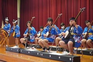 本校には学校のクラブ部活動にも伝承芸能クラブがあり、そこで三味線や太鼓、唄の練習をしています。それに引き続き放課後、希望者を募って、伝承研究会を行っています。この伝承活動を支えるために、毎回、三味線の先生方が講師に来てくださっています。本当にありがたいことです。
