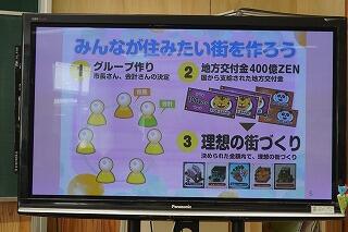 税金について学習した後、市長さんになったつもりで、グループごとに自分たちの「住みたい街」(各グループでテーマを事前決定)を、街作りツールを使い、考えました。