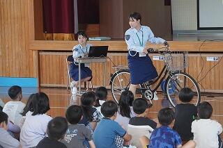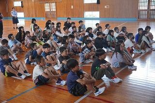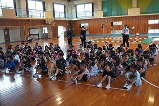 計画では、運動場にコースを作って、1・2年生は歩道の歩き方及び横断歩道の安全な渡り方、3年生から6年生は自転車の安全な乗り方を学習する予定でしたが、雨のため運動場ではなく体育館に変更になり、デジタル資料を使っての指導や横断歩道の渡り方、自転車の乗り方のデモや点検等に変更になりました。