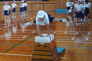 今日は、数歩の助走から両足で踏み切り、跳び箱に両手を着いてまたぎ乗ったり下りたり、足を左右に開いて手を着いて跳び越えて着地したりと、それぞれの場で一生懸命運動に取り組んでいました