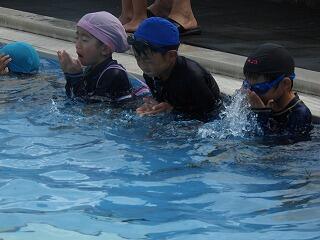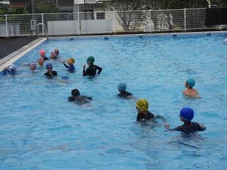 小さな小プールに全員がいっぺんに入るとお風呂状態。水中じゃんけんを楽しんだ後は、何人かずつに分かれて浮いたり潜ったりしました。バタ足で進むのも随分上手になりました。