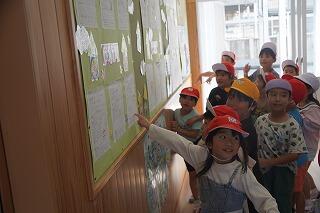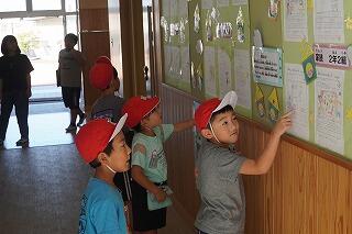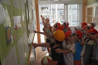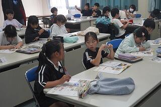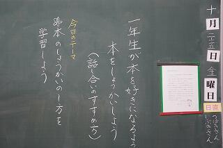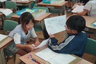 1年生が国語科の学習をしていました。クラスの友達に「しらせたいな、見せたいな」と思うことから書くことを見つけ、五感を働かせながら観察したことを、ふさわしい言葉を選び取って文章を書いていく学習です。