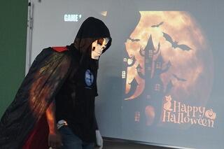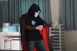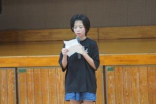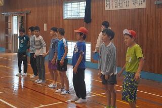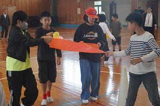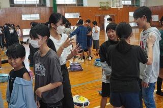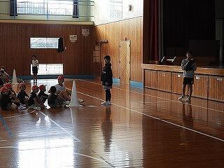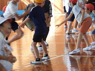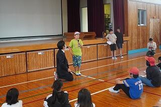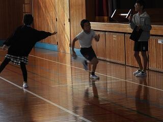 体育館の「宝運び」は、紙を丸めて作った「宝」を体育館の南側から北側の壁まで運びます。しかし、真ん中には一直線に並んでいるおにがいて、タッチされると元の位置に戻らないといけません。言葉だけでは分かりづらいので、児童委員会が実際にやってみせてくれました。