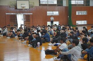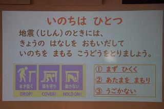 6日(水)の水1タイム(朝の活動の時間)に、全校一斉に「命の集会」を実施し、事前学習を行いました。基本は「まず低く、頭を守り、動かない」です。教室では?、運動場では?、体育館では?など、想定してどのような行動を取ればよいか確認しました。