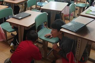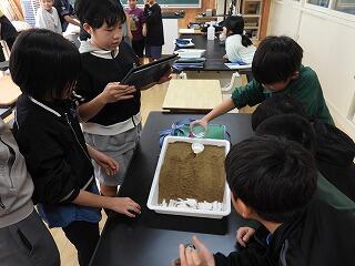 あちらの班でもこちらの班でも水が流れる様子を目で追っています。ここで活躍するのがタブレットです。動画に残すと、何度でも確認することができます。