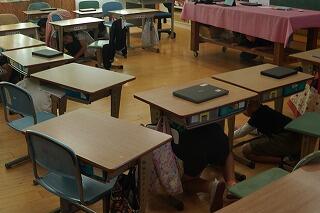 「シェイクアウト」とは 地震に備える防災訓練です。事前学習、訓練(それぞれの場所で机の下に隠れるなど地震から身を守る行動を約1分間実践)、振り返りがセットになった訓練です。