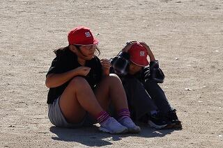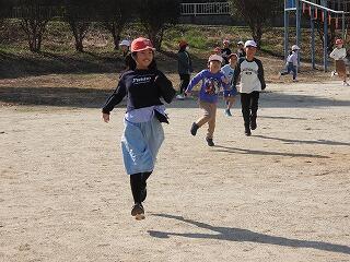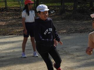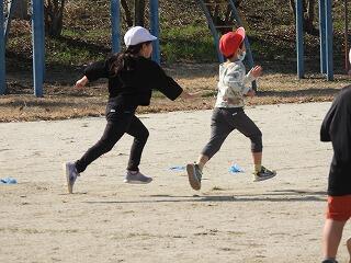 白帽子が走り出すと、赤帽子は右に左に逃げ回ります。氷鬼は、動けなくなった子を見つけて自分で助けに行けばいいのですが、このゲームでは2人組にならないと助けに行けません。見る見るうちにつかまっていきます。それでも、巧みにステップを踏んで鬼を翻弄する子もいました。白帽子の子が疲れ果てて座り込んでいる姿も見られました。頑張って追いかけ続けた結果ということでしょう。うまく捕まえることができたのでしょうか。
