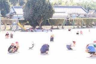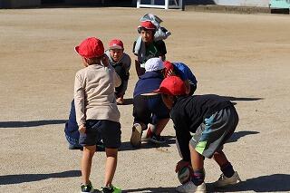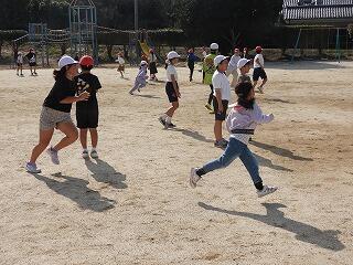 運動場の「レンチン鬼」は、鬼にタッチされたらその場で動けなくなるが、味方からタッチされるとまた動けるようになる氷鬼の「応用版」です。味方2人が手をつないで作った輪を動けなくなっている子の頭の上から通すと動けるようになるというルールです。