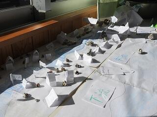 これまで、川の上流から下流までの様子を調べました。「川の上流は流れがせまく急で、ごつごつした大きな岩がある。下流は川幅が広くなり流れが緩やかになるので小さな砂なども堆積する。」ということが分かったので、自分たちで川の模型を作って、その働きについて調べることにしました。