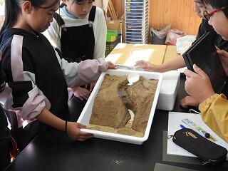 さて、この時間は、砂の入ったバットが登場しました。川に見立てた筋を作り、そこに実際に水を流してみるようです。