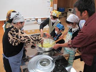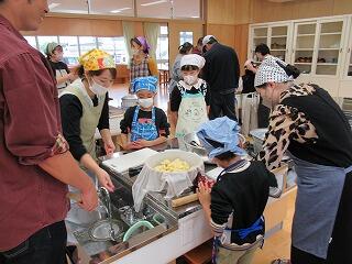 先生のサポートを受けながら、さつまいもをスティック状に切ったり、フライパンで炒めたり、砂糖を絡めたりしながら、力を合わせて上手に作ることができました。