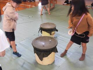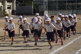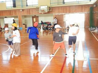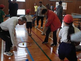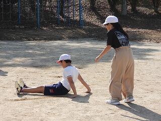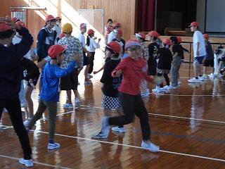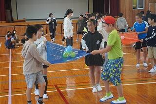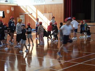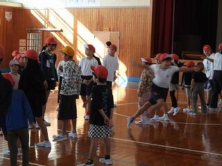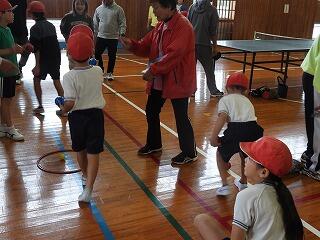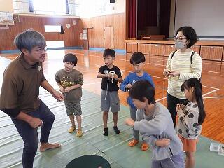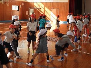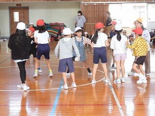 音楽「あの橋が落ちる前に」に合わせて体を動かしたり、じゃんけん列車をしたり、ボール運びリレーをしたりしました。最後に感想をお互いに発表し合い、記念撮影をしました。