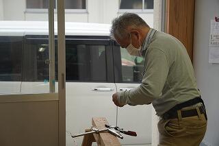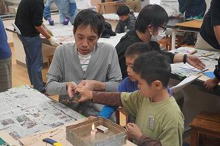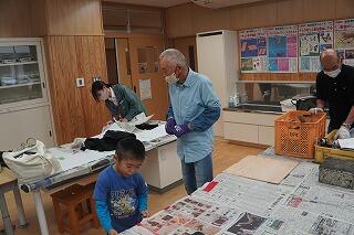 まずは、どこを縫えばいいのか分かりやすいよう印をつけていきます。大型テレビに映し出された図を見たり説明書を読んだり、それでも分からないときは先生に聞いたり、、、と、それぞれ懸命に取り組みます。この日は2名の先生に加え、保護者も来てくださっており、心強かったです。ありがとうございます。