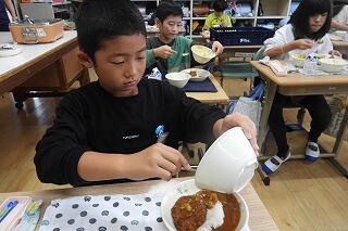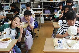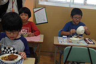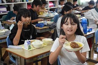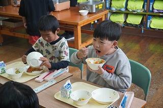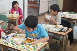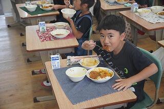お肉にカレーと子どもたちが大好きなものばかり。「めっちゃ、おいしい!」「最高!」「いつもこのメニューだといいのに!!」「しあわせ!」と笑顔で話してくれました。