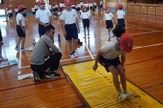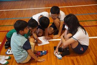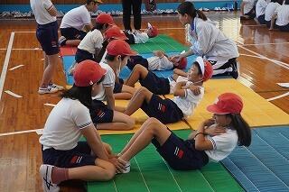 体力テストは6年生を班長とした縦割り班(1年生から6年生までのメンバーで構成)でテスト種目を順番に回って実施しました。子どもたちは個人の目標に向かって一生懸命がんばっていました。異学年で、回数を数えたり、記録をしたりしながら、助け合って活動していました。