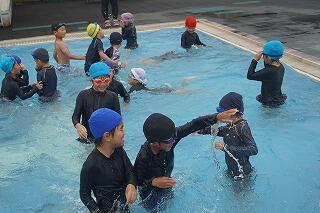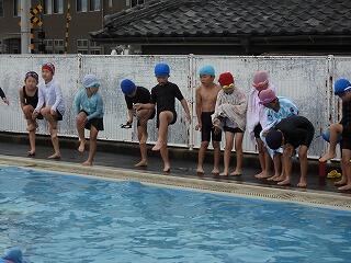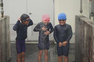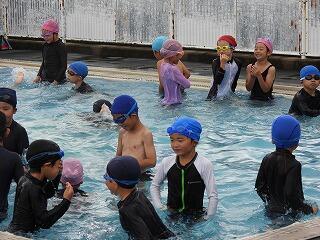 まずは、3・4年生の様子です。プールでの注意事項をしっかり聞いたら、シャワーを浴びて水に足をつけます。