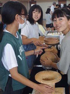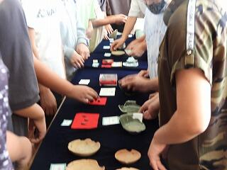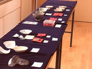 そこで、2班に分かれ、1つの班は土器や茶器、都城で発掘されたお椀などを見せていただきました。