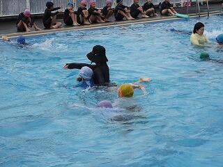 昨年度まで小プールを使っていた3年生には大プールは少し深すぎるかも。でも大丈夫、先生がしっかりサポートしてくれました。