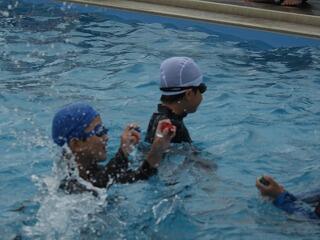 その後、プールに沈んだゴムボールを拾う「宝探し」をしました。なんと黄色い帽子をかぶった子は、一人で6個も拾っていました。