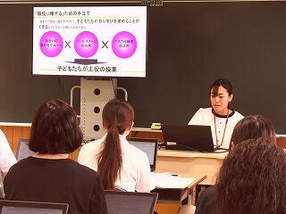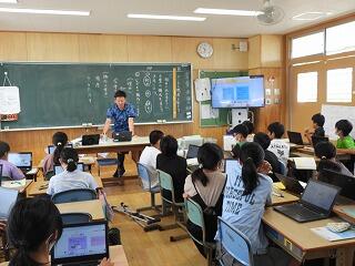 まず、授業参観をしていただきました。1人1台端末を活用して学習している様子、話合いをしている様子、問題を解いている様子、水泳の練習を頑張っている様子等を参観していただきました。