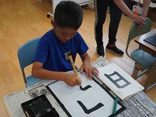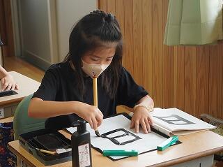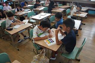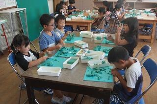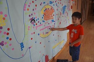 「夏休みに楽しかったこと!」という題材で、海や川、プールで遊んだこと、バーベキューをしたこと、映画をみたこと、遊園地に行ったこと、家族でお泊まりに行ったことなど、思い思いに楽しい作品を作っていました。まだ、途中ですが、発想豊かに工夫された作品が多かったです。