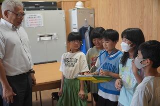 マイクロバス2台で乙房小から庄内地区公民館に移動し、「関之尾むかえびとの会」の皆様が、関之尾を水源とする3本の用水路の説明や、前田用水路の開発に尽くした坂元源兵衛さんの紙芝居を見せてくださいました。