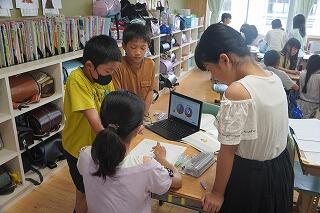 昼休み時間の様子です。図書室が大人気でした。タブレットPCを使っている子、読書をしている子、係活動をしている子と、それぞれに過ごしていました。