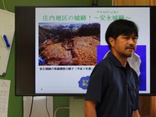 子どもたちが社会科の授業で学んできたそれぞれの時代の出来事や人物と絡めながら、都城の歴史について話してくださいました。「島津」「北郷」という都城ゆかりの苗字の由来も知ることができました。庄内にも城跡があるということで、説明を聞いている子どもたちの目がキラキラ輝いていました。