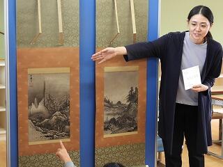 もう一つの班は、水墨画で有名な雪舟の作品を見せていただきました。さすがに本物というわけにはいきませんでしたが、本物を基に10種類ものインクを用いてかなり精度の高い色合いで再現して印刷されたものということでした。