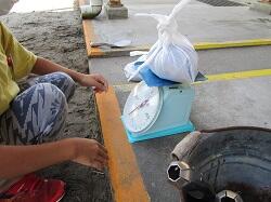 砂を ビニール袋に 思い思いに入れ はかりにのせて。。。