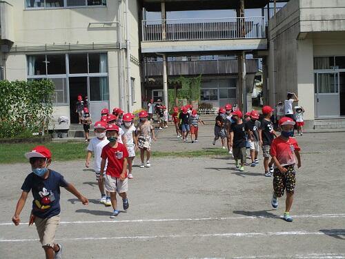 運動場にお・は・し・も(おさない・はしらない・しゃべらない・もどらない)を守って避難し、人数確認した後は、密を避けるために 教室でGooglemeetを使っての事後指導としました。