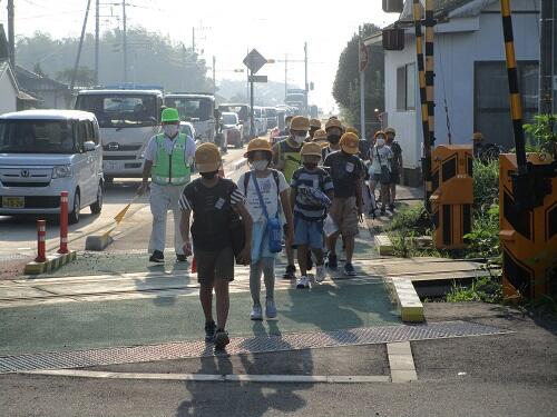 交通量が多く、踏切を横切る通学路も、スクールガードのみなさんに見守られながら、安心して登校できています。学校前の歩道の舗装工事ももう少しで終わりそうです。