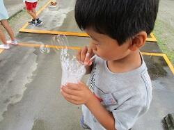 ゆっくり吹くと大きなシャボン玉、勢い良く吹くとたくさんのシャボン玉ができる!少なくなったら、シャボン玉液をブクブク吹くと、コップからあふれて楽しい!