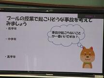 心肺蘇生法についてのDVDを視聴した後、水泳指導で予想される事故について話し合い、溺水事故を想定した演習を行いました。