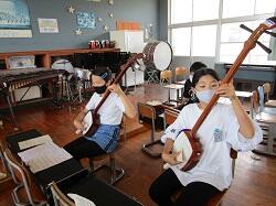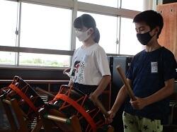 運動場に出られない日の6年生。各場所に分かれて乙房小学校伝統の「奴踊り」の演奏の練習をしていました。夏祭りの中止は決まってしまいましたが、披露する機会があることを信じて教え合いながら練習に励むそうです。