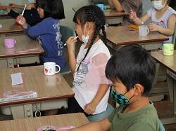 1年生のクラスでは6歳臼歯についてのお話でした。乳歯が抜けはじめている1年生は自分の口の中に興味津々です。飛沫が飛ばないみがき方についても学んでいました。