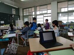 今年度から導入された1人1台のタブレットパソコン。初期設定を終えて、先生も子どもたちも使い方に慣れるための取組が見られます。