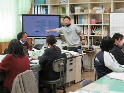 DXとは、デジタル技術を活用しながら業務の改善を図っていくものです。写真は、職員研修会で業務改善を図る研修として、職員がタブレットやパソコンでお知らせや連絡をどこからでも発信したり確認したりすることができる方法を学んでいる様子です。