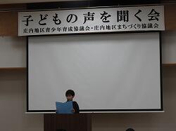 庄内地区公民館で、庄内地区の4校の小学校・中学校の代表児童・生徒が「子どもの声を聞く会」で発表をしました。