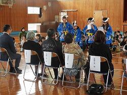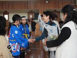 拍手で出迎え、代表児童のお礼のあいさつ、伝統芸能「奴踊り」の披露、来られた方全員に花の贈呈をしました。
