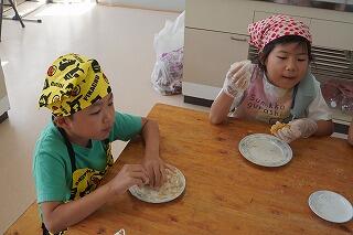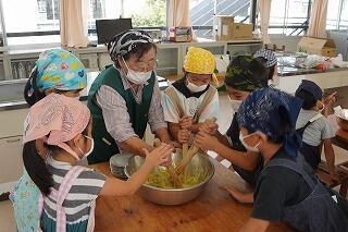地域の方や担任の先生のサポートを受けながら、サツマイモの皮を向いたり、小さく切ったり、餅を入れてついたりしながら、力を合わせて上手に作ることができました。