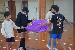 音楽「あの橋が落ちる前に」に合わせて体を動かしたり、じゃんけん列車をしたり、ボール運びリレーをしたりしました。最後に感想をお互いに発表し合い、記念撮影をしました。