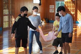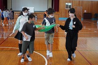 今日は、都城きりしま支援学校の5年生の子どもたちが来校しました。オンラインで交流しているとはいえ、初対面です。最初は、緊張した様子も見られましたが、体を動かすうちに徐々にほぐれてきました。