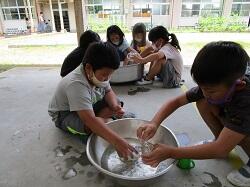 1年生が生活科でシャボン玉遊びをしていました。