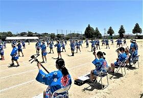 乙房小学校は現在新校舎建設中のため、運動場がせまいので、今年の運動会は、中学校の運動場をお借りして行います。
