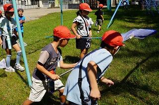 現在の仮設校舎に引っ越してから、初めての地震対応の避難でしたが、先生の指示に従い、みんな真剣に取り組むことができました。今日の避難訓練にかかった時間は3分21秒でした。事前に担任の先生から指導があった「おはしも」をしっかりと守って避難できました。